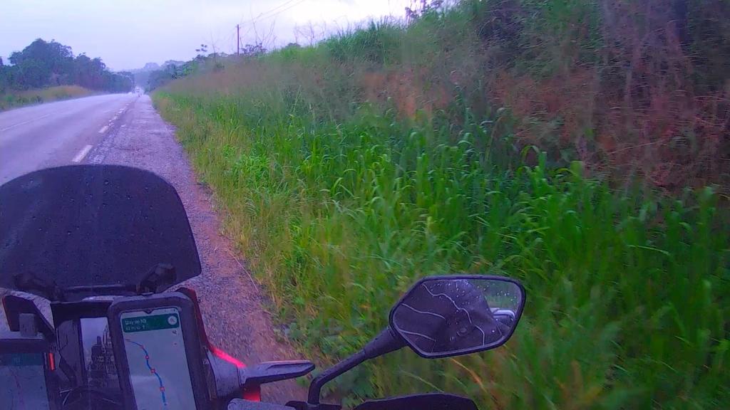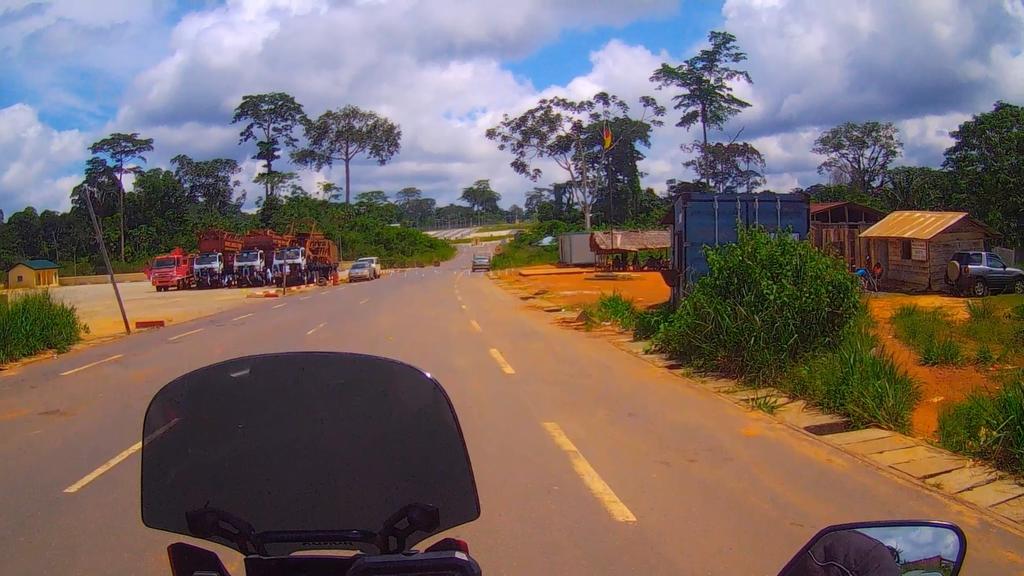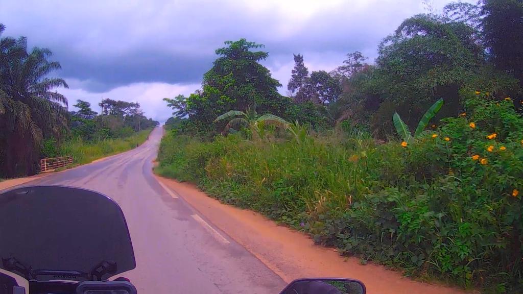 Some lovely stretches of road and the first time for a long time we could just ride without constantly being stopped. It did rain but being hot and humid it wasn't worth putting on rain gear until it really started to pelt down. It didn't last long and by then we were boiling in the rain gear. Sangmelima is quite a big town and finding a hotel and fuel was easy. There was no electricity but the hotel used a generator at night so there was light and some AC.