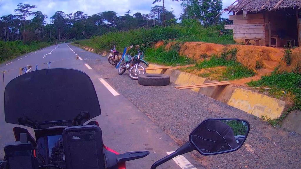 A shorter day was planned as it was too far to make Brazzaville in one day and we'd had a long day the previous day. Plan was to ride from Ouesso to Owanda. Hopefully arrive early afternoon and get a local sim card and find a hotel. The road was really good. Paved all the way with lovely views of dense green jungle on both sides. Lots of dwellings along the way. About 4 roadblocks but only one stopped us and asked for our passports. He took them into a hut and there was a long delay. Not sure what he was doing but he eventually gave them back and lowered the rope barrier.